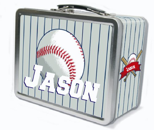 Baseball Personalized Lunch Box by Frecklebox Play ball! The Baseball Personalized Lunch Box from Frecklebox is perfect for your aspiring baseball star. Featuring classic uniform stripes and a baseball in the center, this tin lunch box is sure to hit a home run in the cafeteria. This kid's lunch box from Frecklebox is made of .30 millimeter lead free tin and embellished with printed, laminated high-tack adhesive on all sides. Open up the lunch box lid to find a delightful chalkboard for writing and receiving notes from your loved ones (chalk not included). Lunch time is now a time for fun! Personalize this tin lunch box and it will remain a treasure for your child for years to come. This item is custom made especially for you upon order.